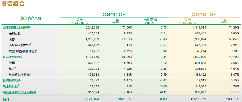 资事堂注意到:截至2025年6月30日,中国人寿的投资资产总规模为7.13万亿元人民币。其中,最受关注的权益类金融资产,短短半年内从1.269万亿元增加到1.426万亿元,净增约1570亿元人民币。(如下图)